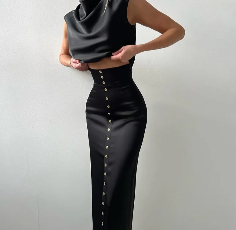 Elegante Crop Top Rock Set Frauen Rollkragen Ärmellose Weste Hohe Taille Taste Lange Röcke 2025, Frühling Dame Satin Solide Outfits