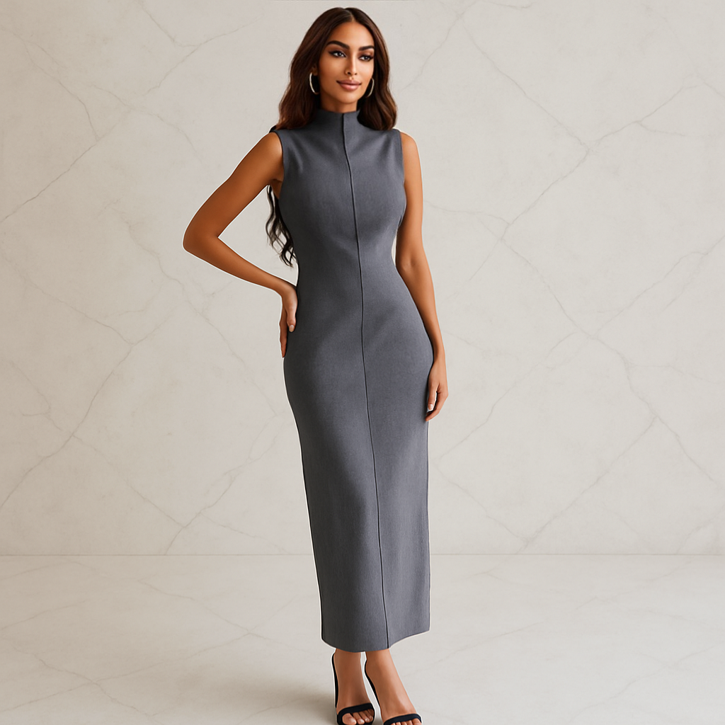 Office Elegantes graues langes Bleistiftkleid ärmellos, figurbetont, leichter Stretch somit sehr bequem