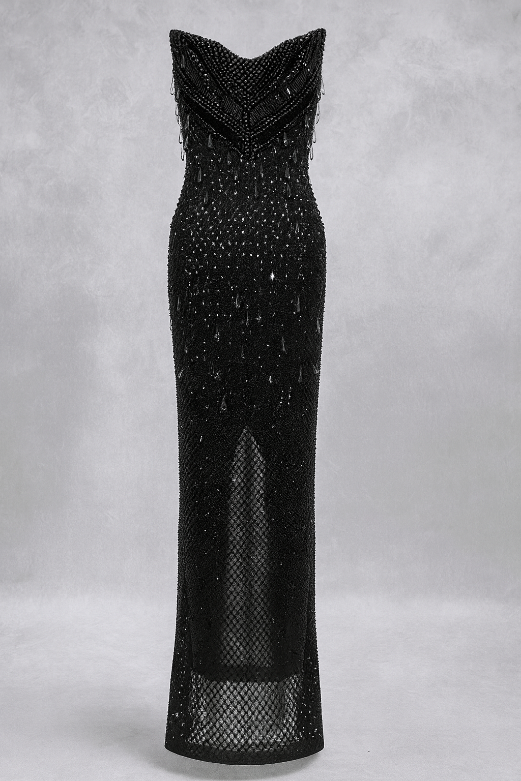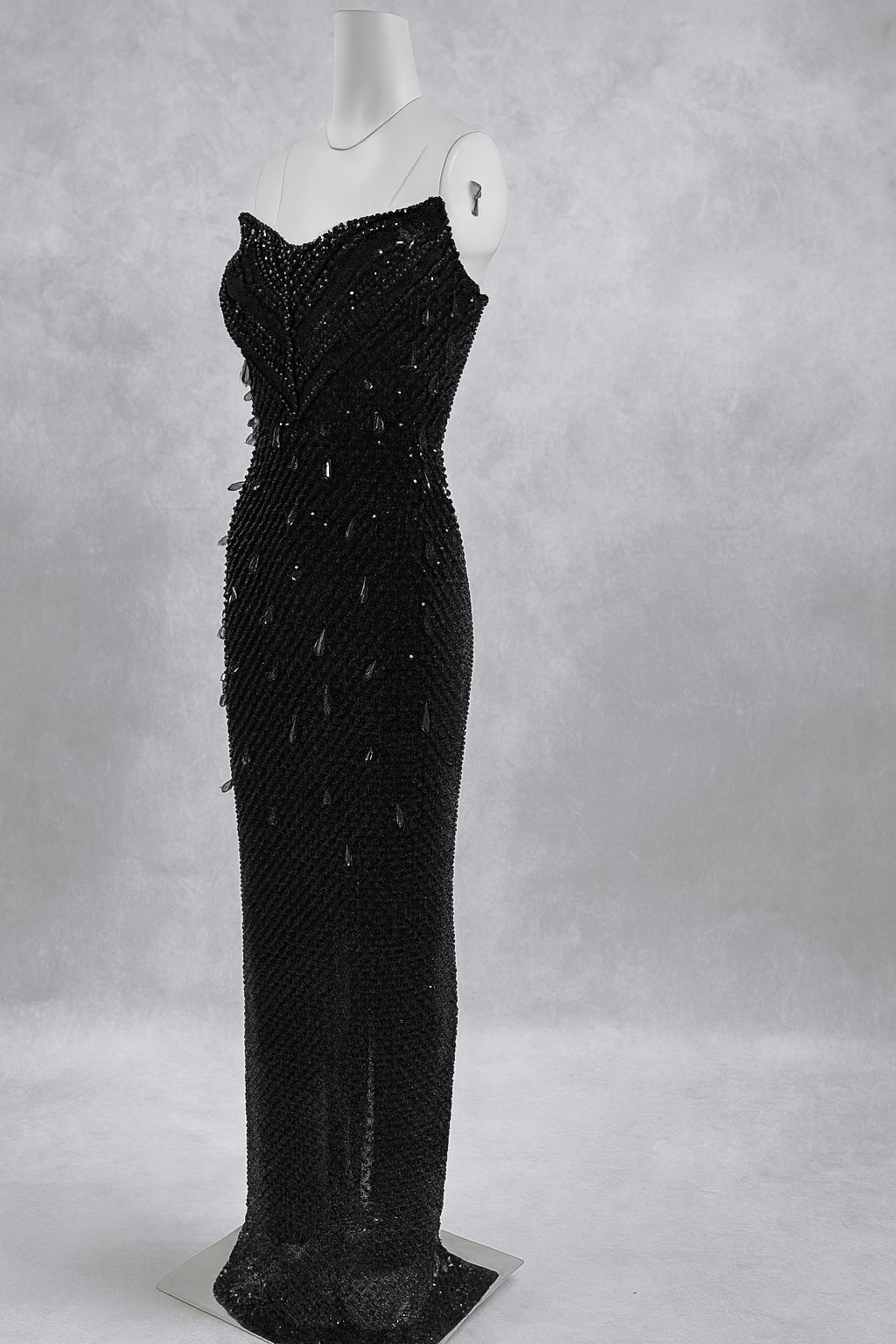 Dieses atemberaubende, figurbetonte Abendkleid ist ein echtes Statement-Piece. Das Design überzeugt durch feinste Handarbeit mit edlen schwarzen Perlen, funkelnden Details und einer eleganten Silhouette, die Ihre Kurven perfekt betont.