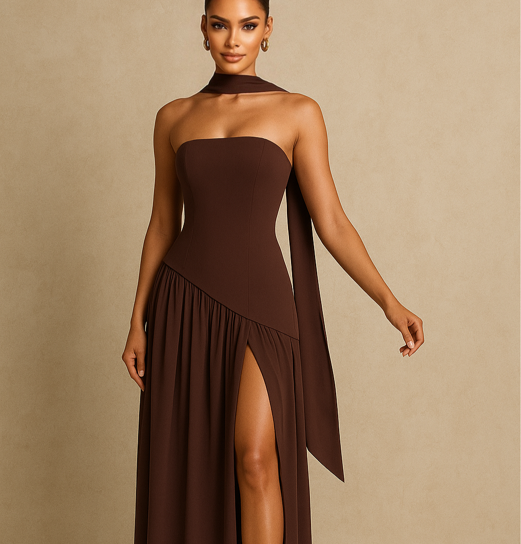 Trägerloses, schulterfreies, sexy Maxikleid für Damen, Patchwork-Schalkragen, Schlitz Oberschenkelhoch    Material: Polyester,Spandex          ...